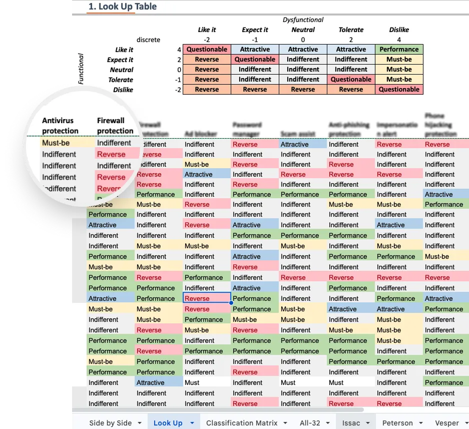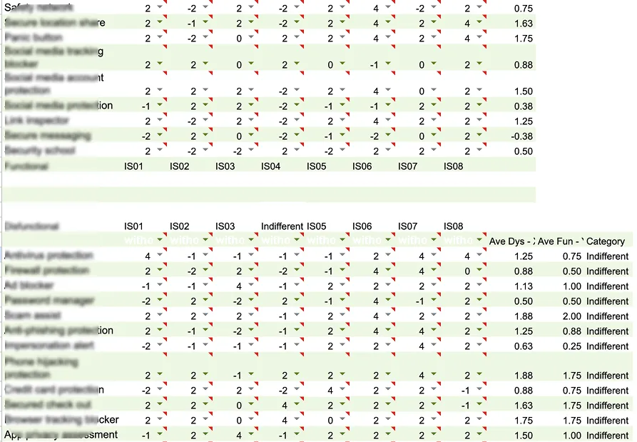 Antivirus Protection, Privacy Guard, and Dark Web Monitoring scored as Must-Be across all users—even though they were labeled Indifferent in the discrete model. This indicates that while users didn’t always articulate these needs, they still viewed them as foundational.