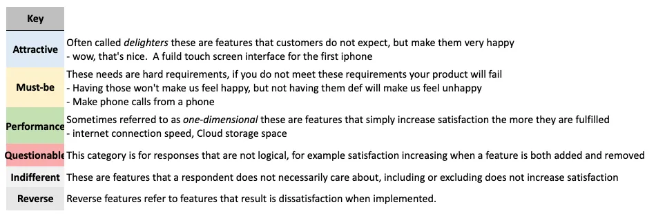 Traditional Kano classification where each feature was assigned to one of the six Kano categories (Must-Be, Attractive, Performance, Indifferent, Reverse, Questionable). For each feature, I then calculated the average percent of respondents that gave each of the available classifications. Finally each feature was assigned to the most common classification that it have been given.