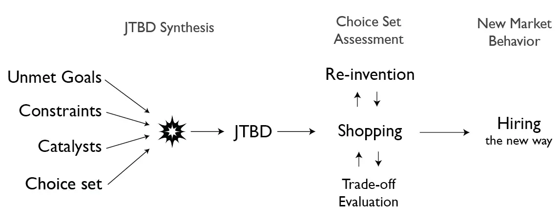 (The JTBD Data Model shows a process of how new market behavior is created. In this case, it shows how a JTBD is created and how it results in someone hiring solution(s) for it.)